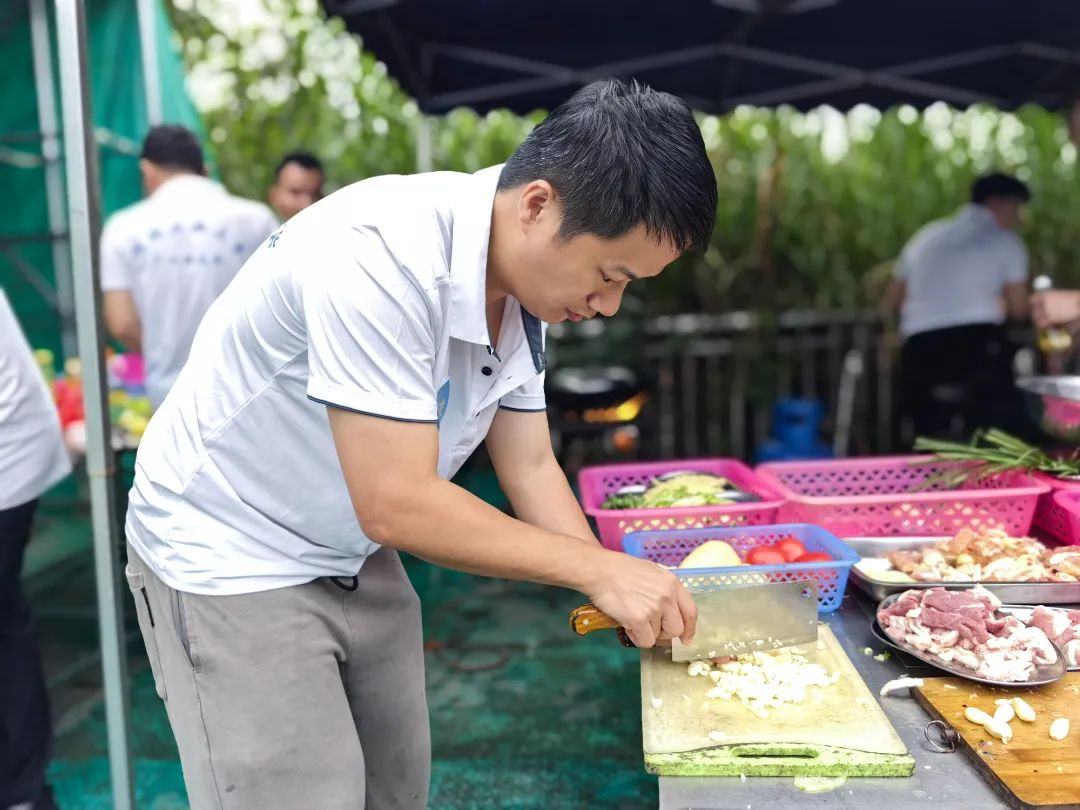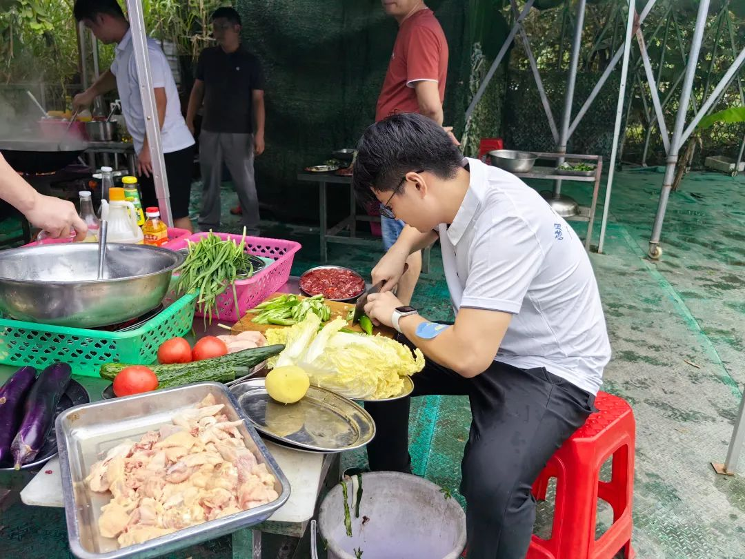 这次团建与其他不同,要吃饭需自己动手,也给了大家充分展示自我的机会。食材已备好备足,大家自由组合,分成三组。新老校友不分彼此,挽起袖子,切菜的切菜、炒菜的炒菜,井然有序、各展其长,有说有笑。