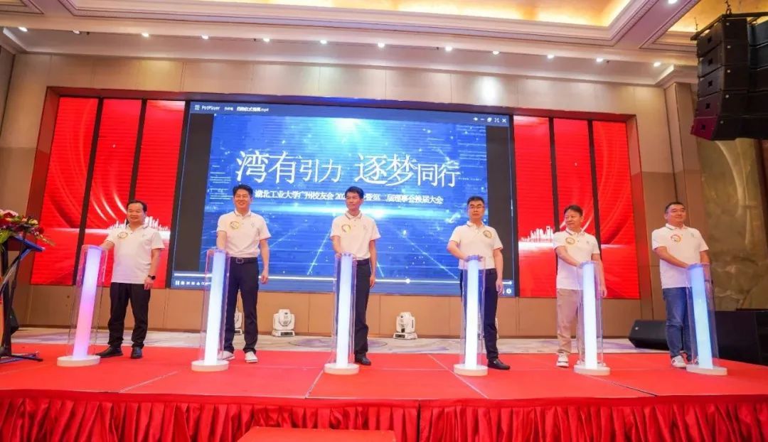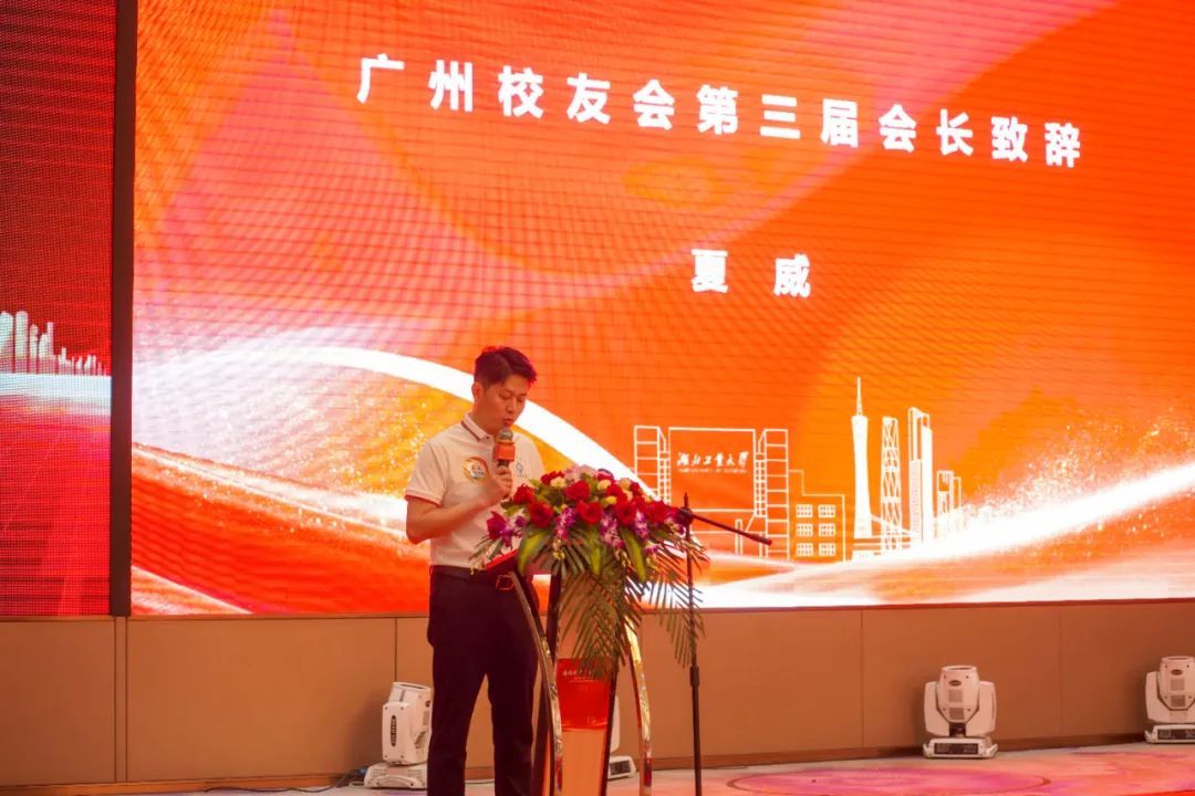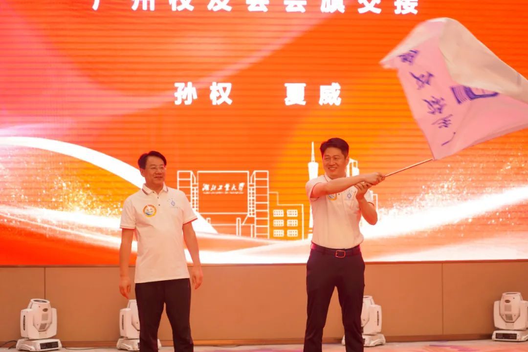 随后进行会旗交接,当第三届新当选会长夏威从第二届会长孙权手中接过会旗时,在主席台上使劲挥舞。这不仅代表组织的传承、责任的传递,更是使命的延续、情怀的接力。夏威在发表当选感言时表示,作为新一届理事会会长,我将时刻铭记母校“厚德、博学、求实、创新”的校训,大力弘扬本会“筑梦敏行、携手共赢”的口号,团结带领新一届理事会全体成员,加强湾区校友的合作和交流,促进校友资源整合和增值,推动校友个人的成长成才、建功立业与时代同频、伴湾区齐飞,努力为母校的发展和建设贡献湾区智慧和力量。